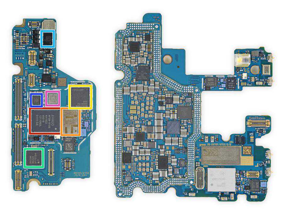 拆开堆叠主板,露出各种IC。红框:12GB三星自家的LPDDR4X内存,内存下面是高通骁龙855SoC;橙框:256GB三星闪存;黄框:高通X505G基带;绿框:NXP80T17NFC控制器;淡蓝:ONSemiconductorNCP59744voltageregulator;深蓝:CirrusLogicCS35L40音频放大器;粉色:MaximMAX77705CPMIC