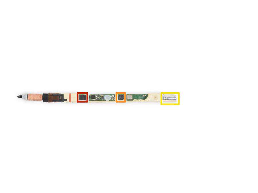 新版的SPen拆解图,红框:一颗神秘的芯片,可能是6轴传感器;橙框:DialogDA14585蓝牙5SoC;黄框:锂电池