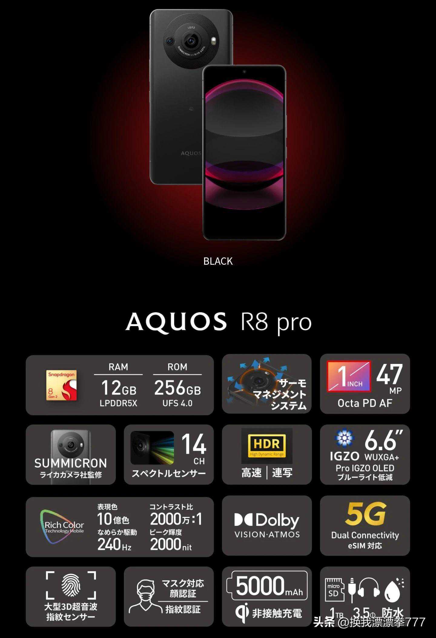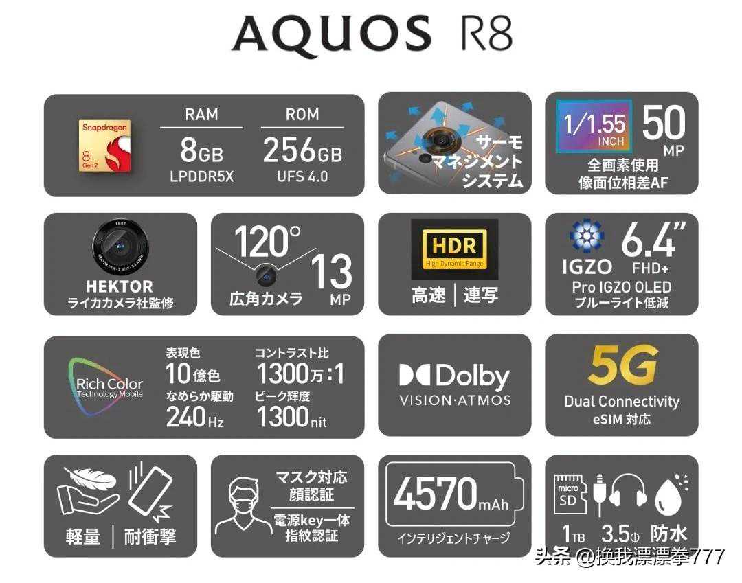 AQUOSR8配备了一颗800万像素前置镜头,后置5030万像素主镜+1300万像素超广角+Leica监制的HEKTOR镜头。HDR处理速度比「AQUOSR7」快40%,内置4570mAh电池,支援Wi-Fi6、蓝牙5.3、IPX5/IPX8,重约170g,保留3.5mm耳机孔。
