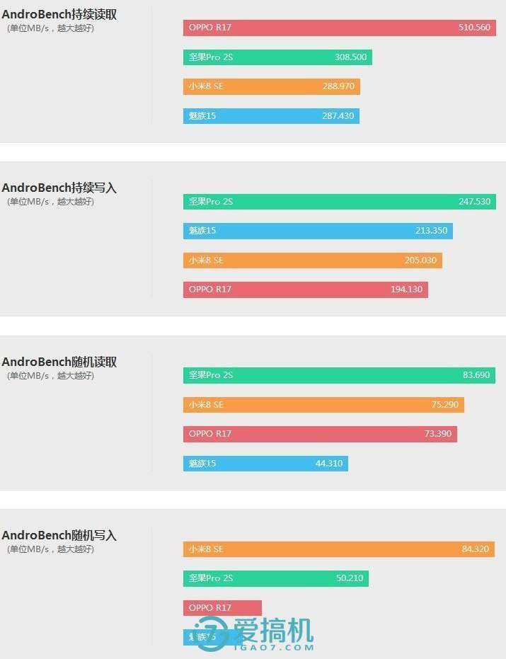 结果没有出现任何意外,坚果Pro2S和小米8SE都是正常的骁龙710,,CPU和GPU部分都在同一个水平,坚果的闪存性能稍强。性能和骁龙670、660呈梯度排列。详细内容可以到爱搞机跑分库查看,这里就不赘述了。