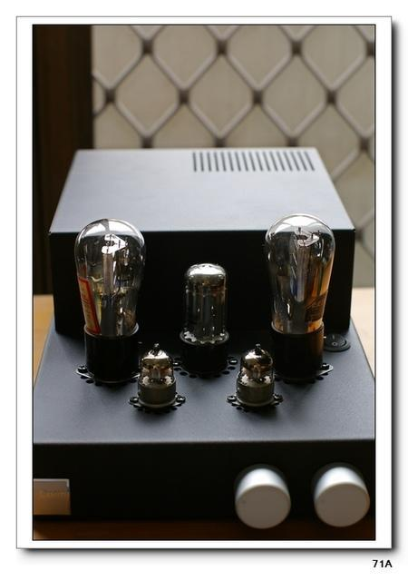 这一台是亲手打造的71A扩大机,功率不到一瓦,声音却是有着无限的魔力与魅力。上头得茄子形真空管是1932年出厂,天啊73岁了,老爷级的管子了。