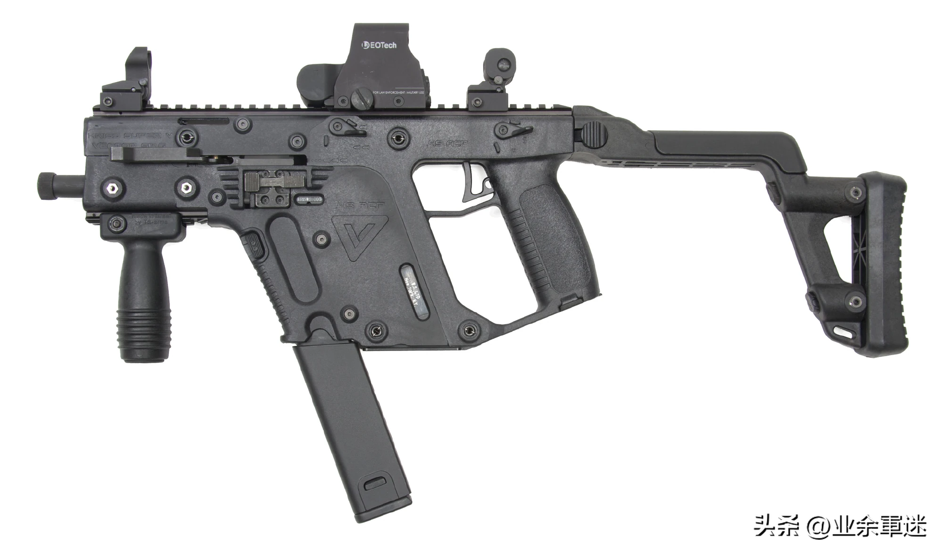 KrissVector优点:独特后座部设计、低后坐力、可调整枪托、高精度缺点:较高的价格、特殊的.45ACP口径弹药不易获得参数:口径:.45ACP、全长:629mm、射速:1200发/分钟、有效射程:100m