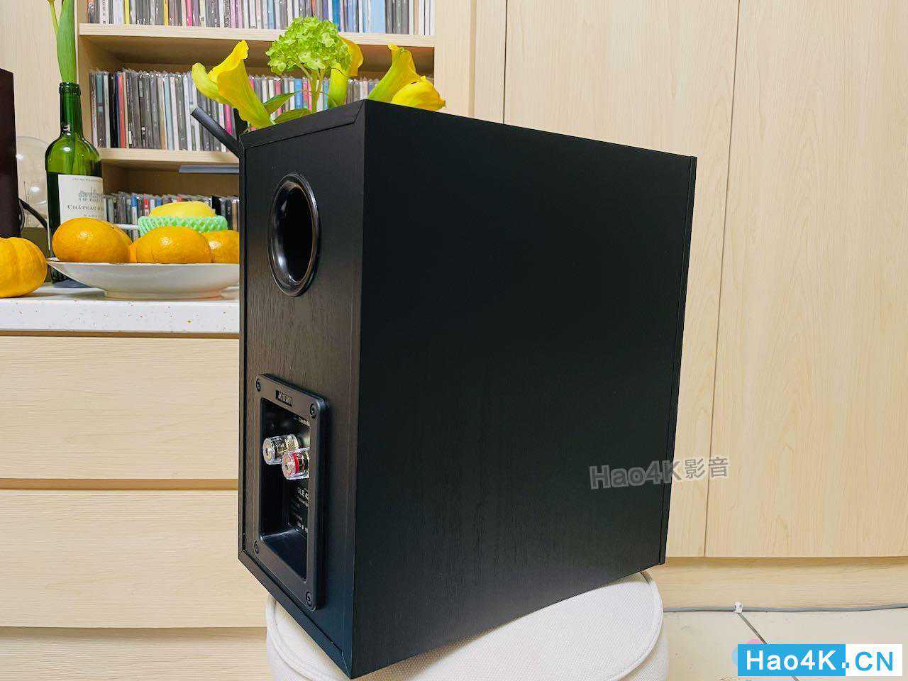 ▲另一支也掀开了,可以看到音箱背板是SingleWire接口,反射孔也是在背面,名牌上面则是清楚标示这对音箱是在捷克所生产制造的。