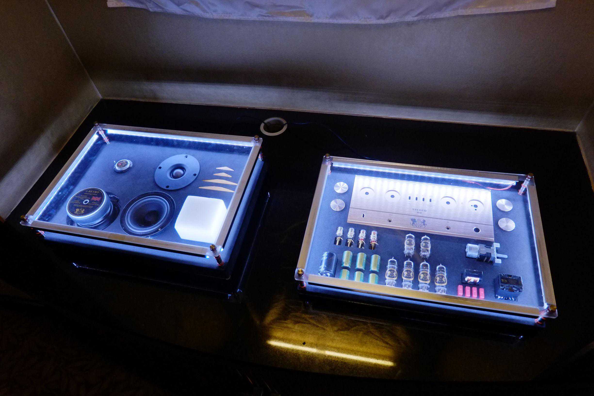 来自新加坡的新晋品牌创世纪品牌展出旗下音箱产品,从腔体到脚架均为全透明设计,小小的尺寸能量感颇强。