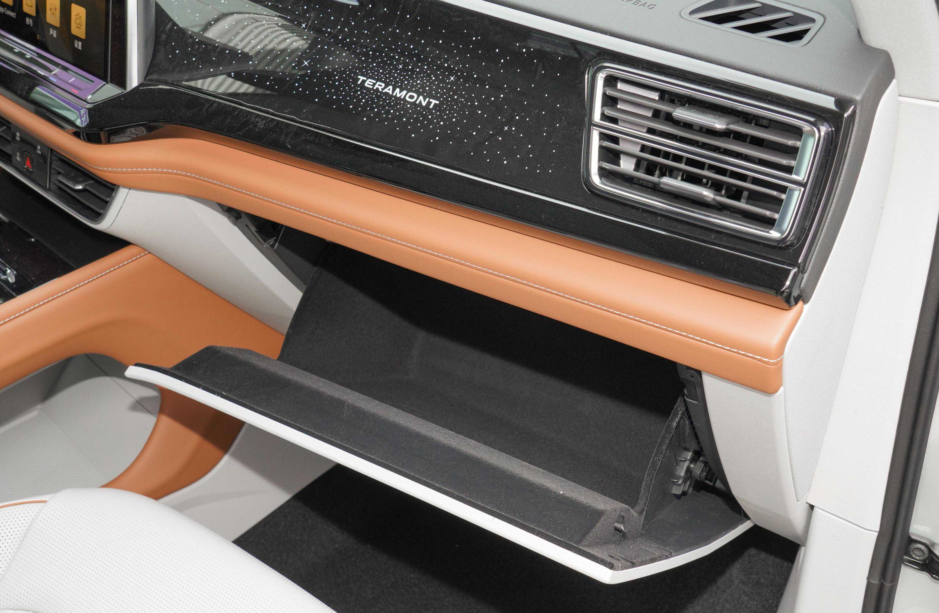 内饰设计,全系中控布局朝主驾倾斜,配备悬浮式中控屏,镂空式中央通道,不同的是,330TSI两驱豪华版和380TSI四驱豪华版配备灰色鳞纹饰板,而其他车型配备烤漆面板且面板上布置了星空环绕式透光饰条。