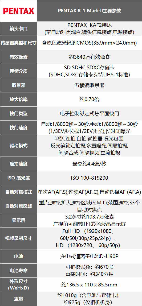 PENTAXK-1MarkII主要参数: