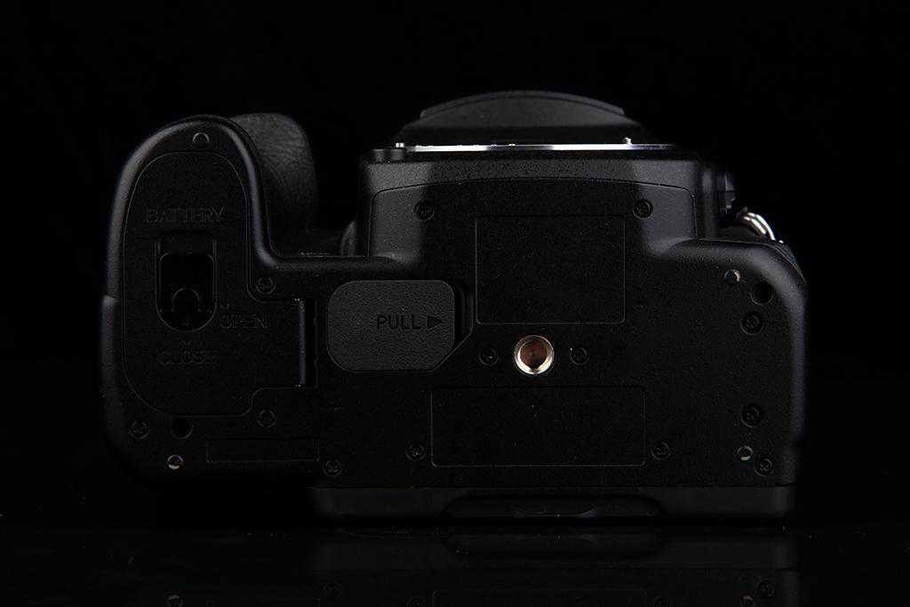 底部的设计比较常规,电池仓加三脚架螺孔的配置,外加竖拍手柄接口。