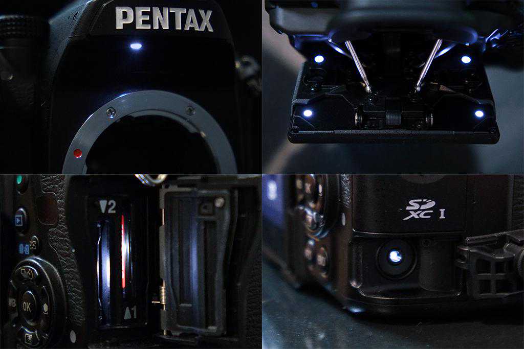 PENTAXK-1MarkII在镜头卡口上部、液晶显示屏的背面、存储卡插槽和快门线释放端口处搭载有LED灯。按下照明按钮后点亮。这些照明灯将方便用在夜晚的室外以及昏暗的室内等场所,也能正常地进行镜头、相机背面按钮的操作或存储卡的更换、快门线的装配操作,提升了拍摄的效率与便捷性。