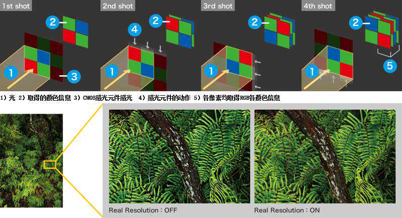 像素偏移分辨率系统是具有超越了拜耳阵列方式界限的解像力和精致的色彩还原,生成高精细图像的技术。运用防抖机构,将影像传感器产生微动的同时连续拍摄4张照片,每个像素可获得RGB的各颜色信息和亮度信息,生成超高清图像。不单是解像力,还不会发生伪色现象,同时能减少高感光度噪点等,可以大幅提升画质。