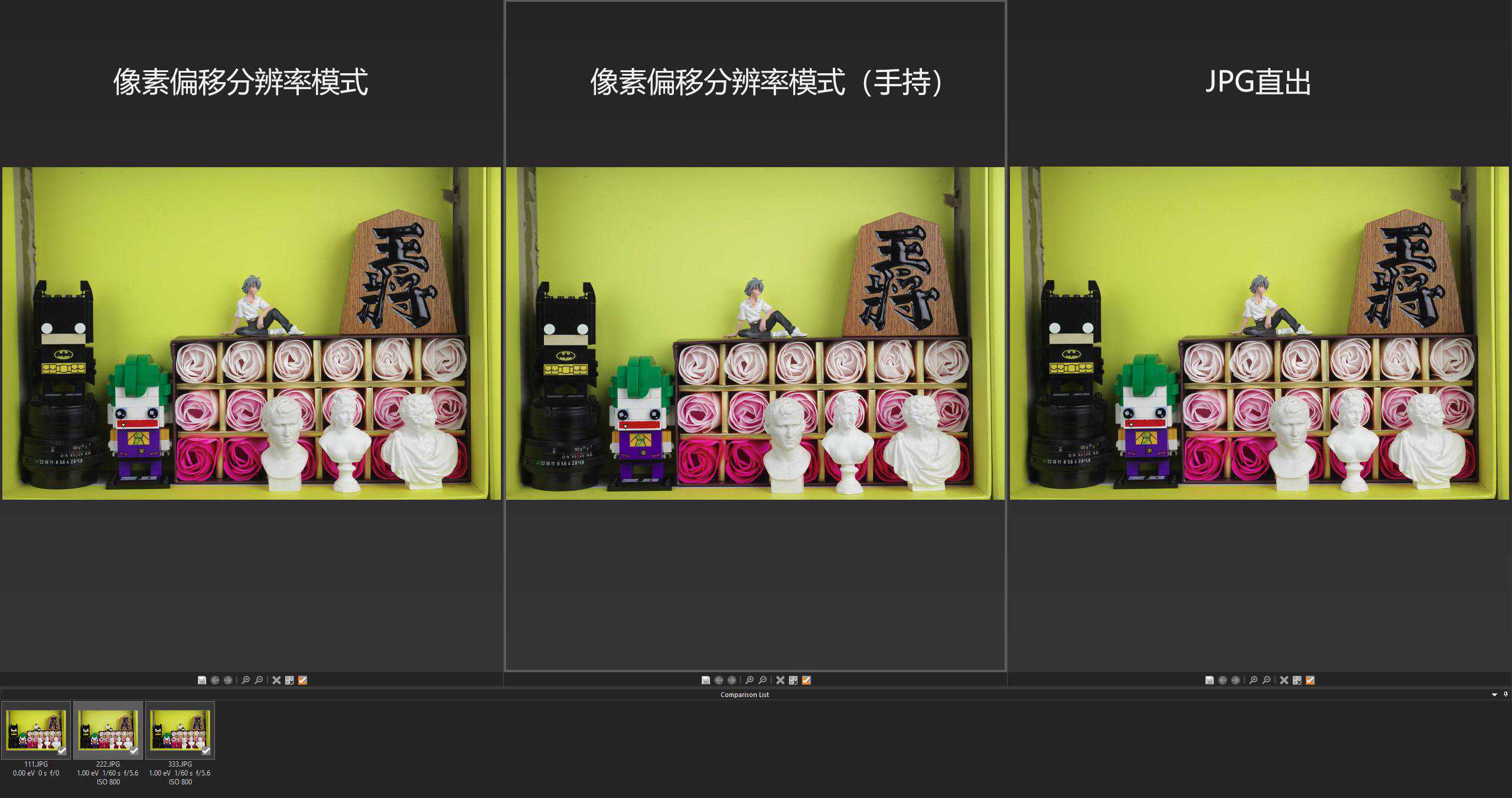 这里我们通过实际拍摄来看下该系统的具体效果。测试中,我们分别使用像素偏移分辨率模式(on)、像素偏移分辨率模式(手持)和像素偏移分辨率模式(off)这三个状态来拍摄对比。