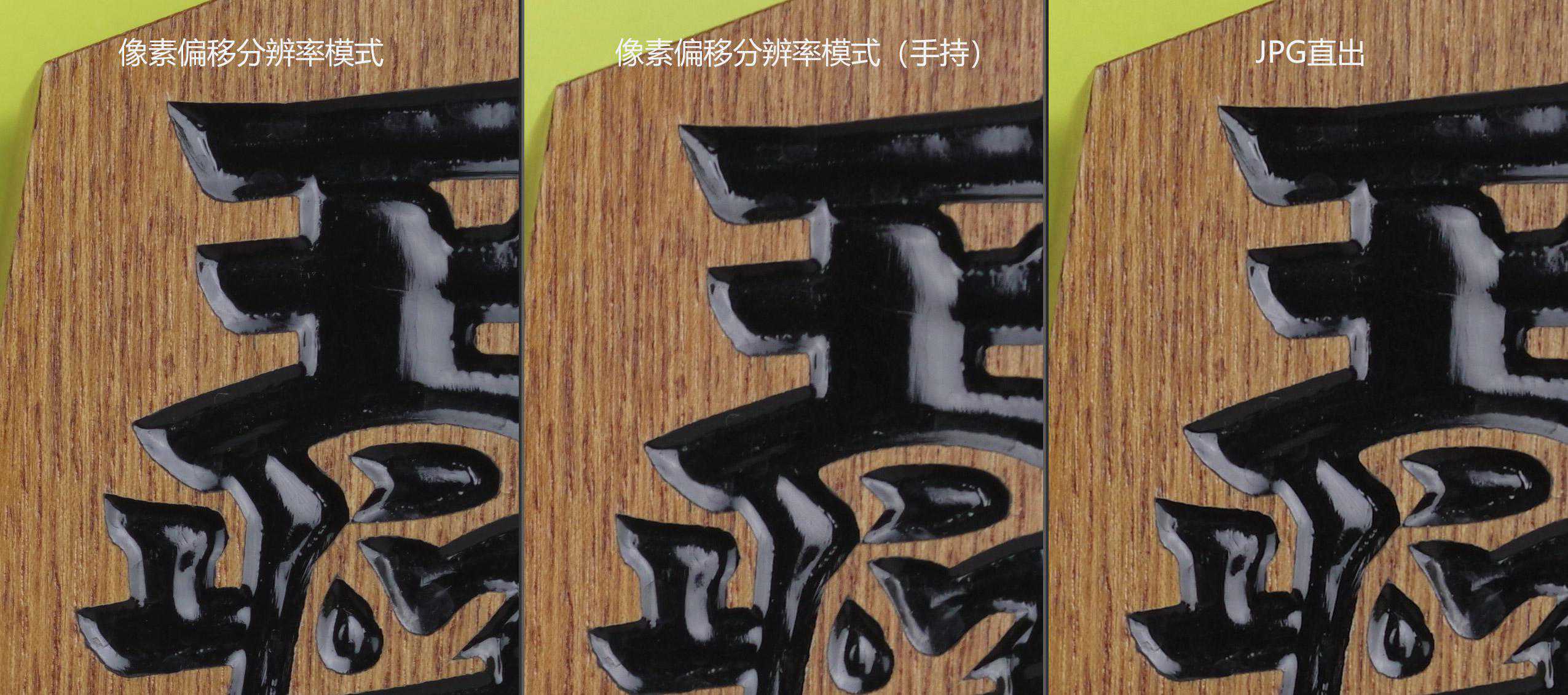 从全图看,由于压缩的关系,所以可能很难分辨出三种拍摄设置的区别,但通过100%的细节对比,就可很明显的看出了区别。像素偏移分辨率模式(on)下,对于木质纹路的细节表现及分辨力都要明显优于像素偏移分辨率模式(off)。手持模式略微差一些,但总体图像还是清晰可用的。