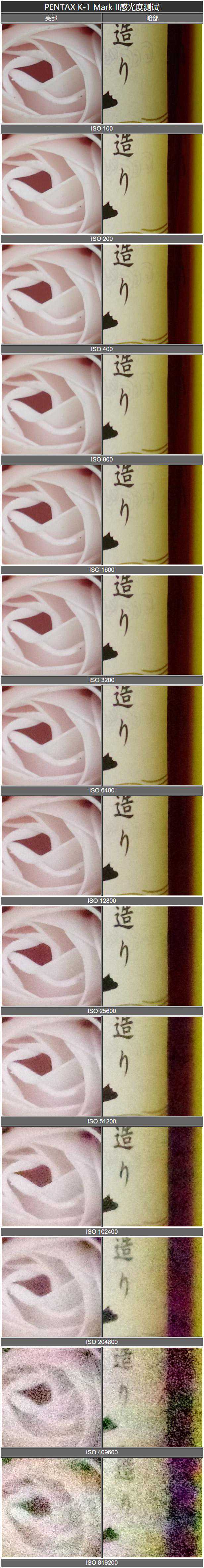 PENTAXK-1MarkII采用了有效像素约3640万的35mm全画幅CMOS感光元件,配备了高性能图像处理引擎“PRIMEIV”。原生感光度从ISO100-819200。下面我们就来看下实际的感光度表现。