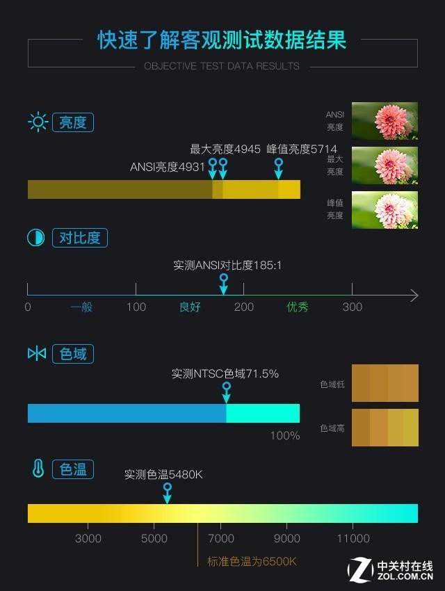 投影机的数据测试我们主要采用美国国家标准协会制订的ANSI标准,这一标准也是业内公认的权威标准。并考察以下几个方面:最大亮度、峰值亮度、优化亮度以及投影机的对比度色彩等方面。接下来我先为大家简单解释几个专业术语:首先就是峰值亮度,特指在最亮模式下,单点能达到的最高亮度,一般都出现在中心点;最大亮度,指在最亮模式下,画面平均能达到的亮度,这个数值的可参考价值更高;优化亮度又名ANSI亮度,是在投影机刚好能够分辨出八个灰阶情况下的9个测试点的平均亮度。