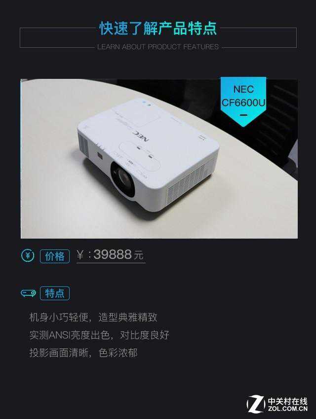 现在的会议室正在向着智能化和简洁化的方向发展,市场上对于高亮度的高端商务投影需求很大。今天我们要评测的NECCF6600U商务投影就是一款采用3LCD技术的高端商务投影机、这款产品的标称亮度达到了5600流明,这是个什么概念呢?商务投影的亮度一般在3000~4000流明之间,而工程投影的亮度标准就是6000流明以上。因此NECCF6600U在商务投影中算是亮度非常高的了,5600流明的亮度甚至可以称之为“准”工程投影产品。那么这款高端商务投影的实际表现究竟如何呢?下面就请您跟我一起来看看吧。