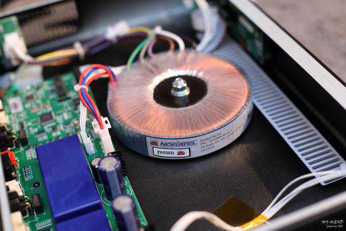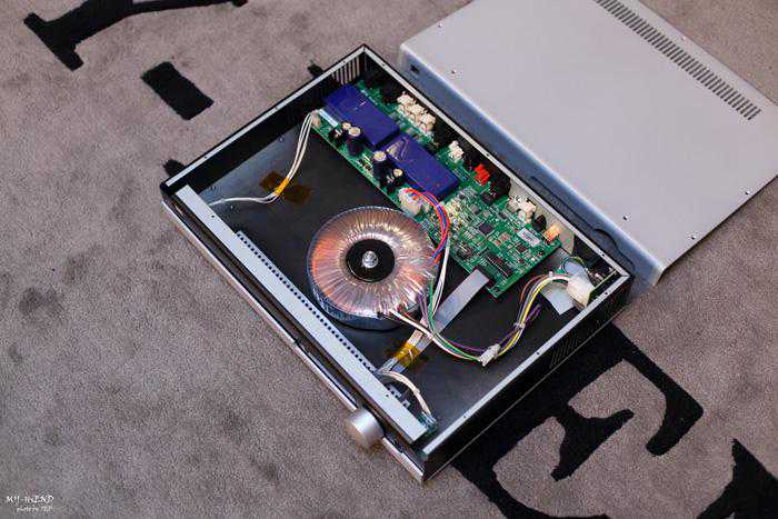 打开後可以看到一个大型环形变压器,後方则是数位电路板(右侧)与类比电路板(左侧)。