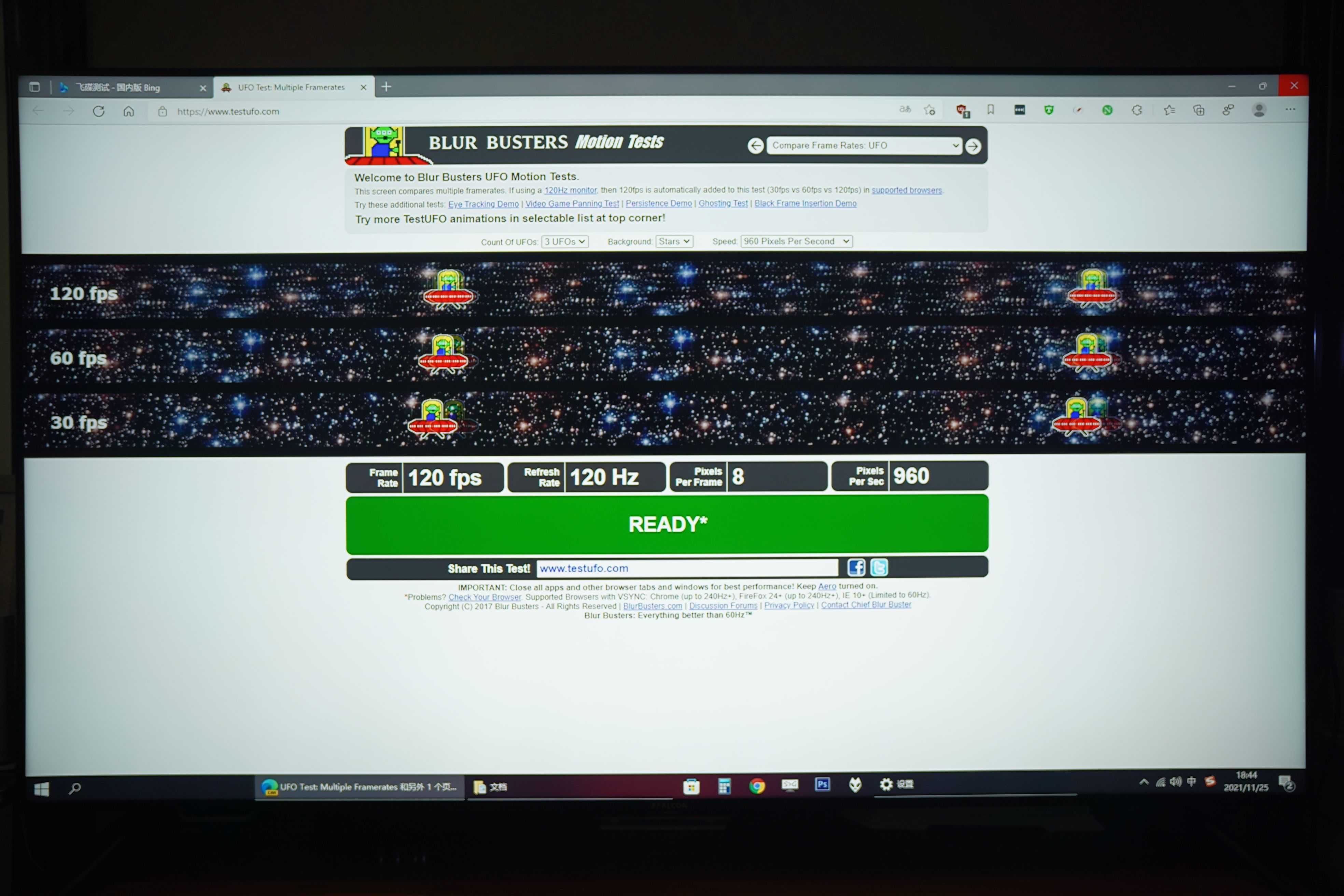 ▼而用这台电视玩游戏可以说是体验极佳,主要原因有两个方面,一是使用了4K120Hz的屏体,高刷带来的丝滑流畅的体验能大幅度提升用户的感受,所以现在高刷屏已经逐渐成为主流了。这里我在连接电脑后,用飞碟测试可以看到屏体的刷新率确实达到了120Hz。