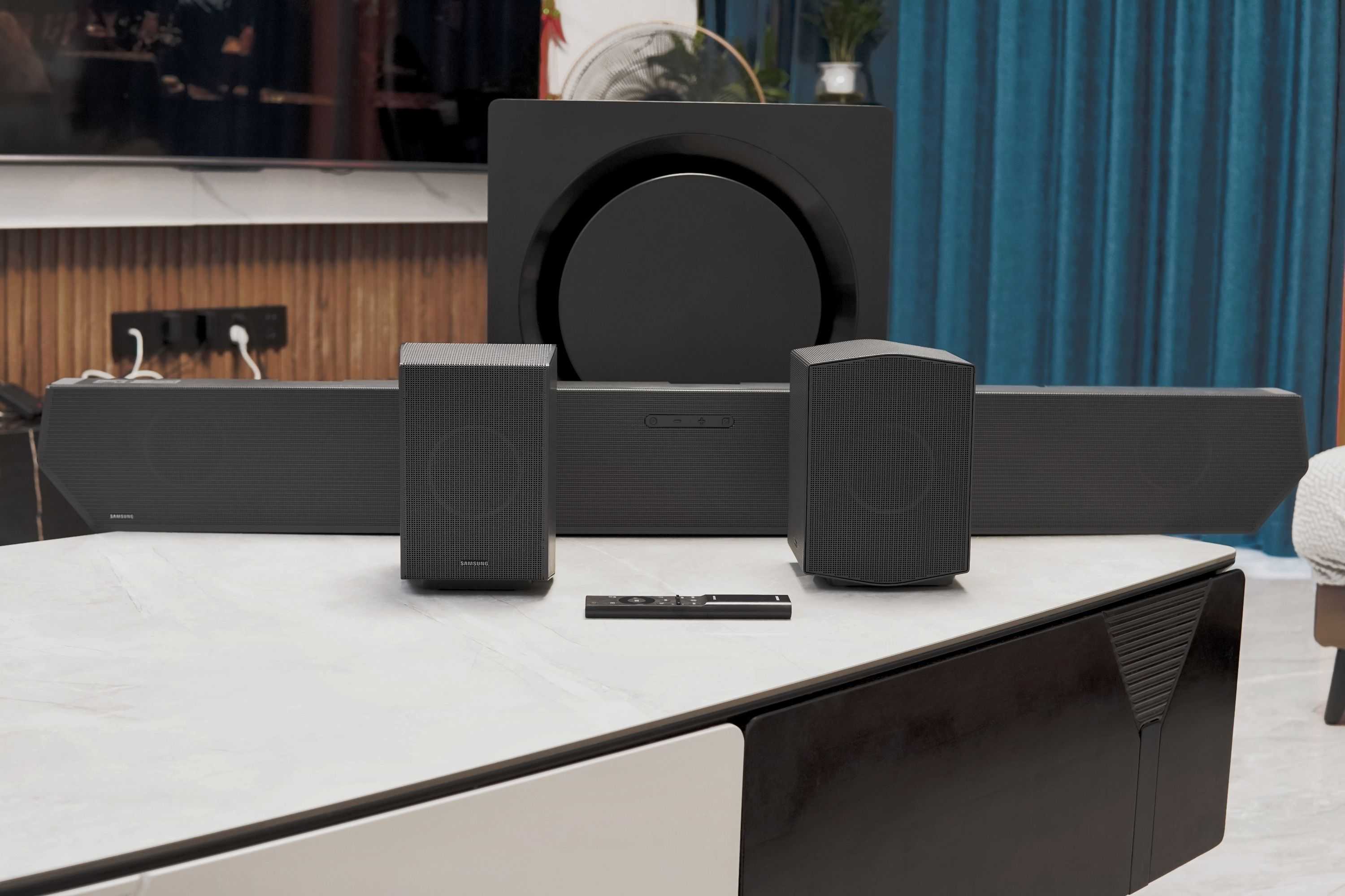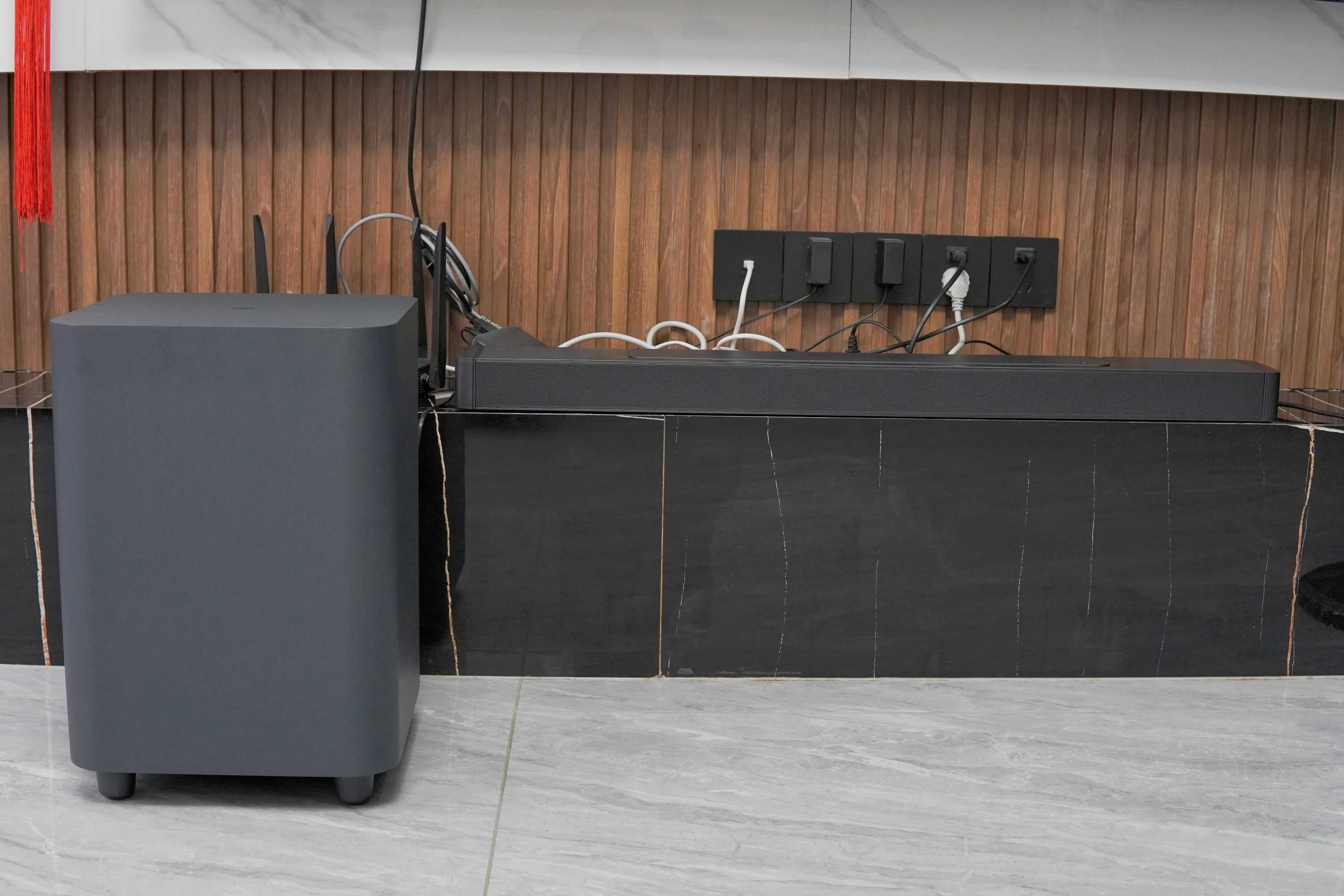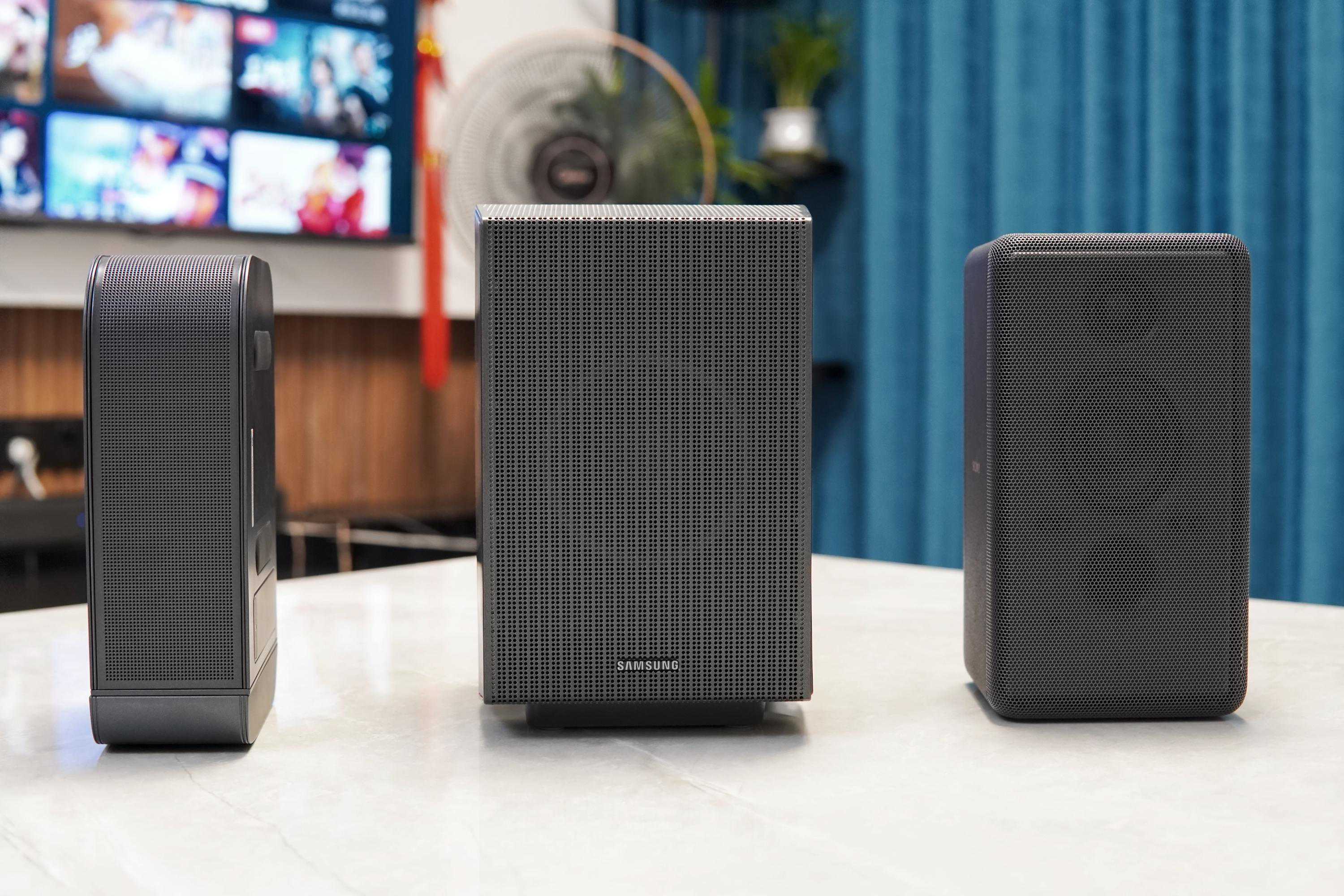 当下更通行的做法是7.1声道回音壁——1个5合1主音箱+2个后置音箱+1个低音炮,这种做法即是本文讨论的索尼HT-A5000和JBLBAR1000,而本文涉及的另一款回音壁三星HW-Q990C,则是11.1声道回音壁,采用1个9合1主音箱+2个后置音箱+1个低音炮结构。