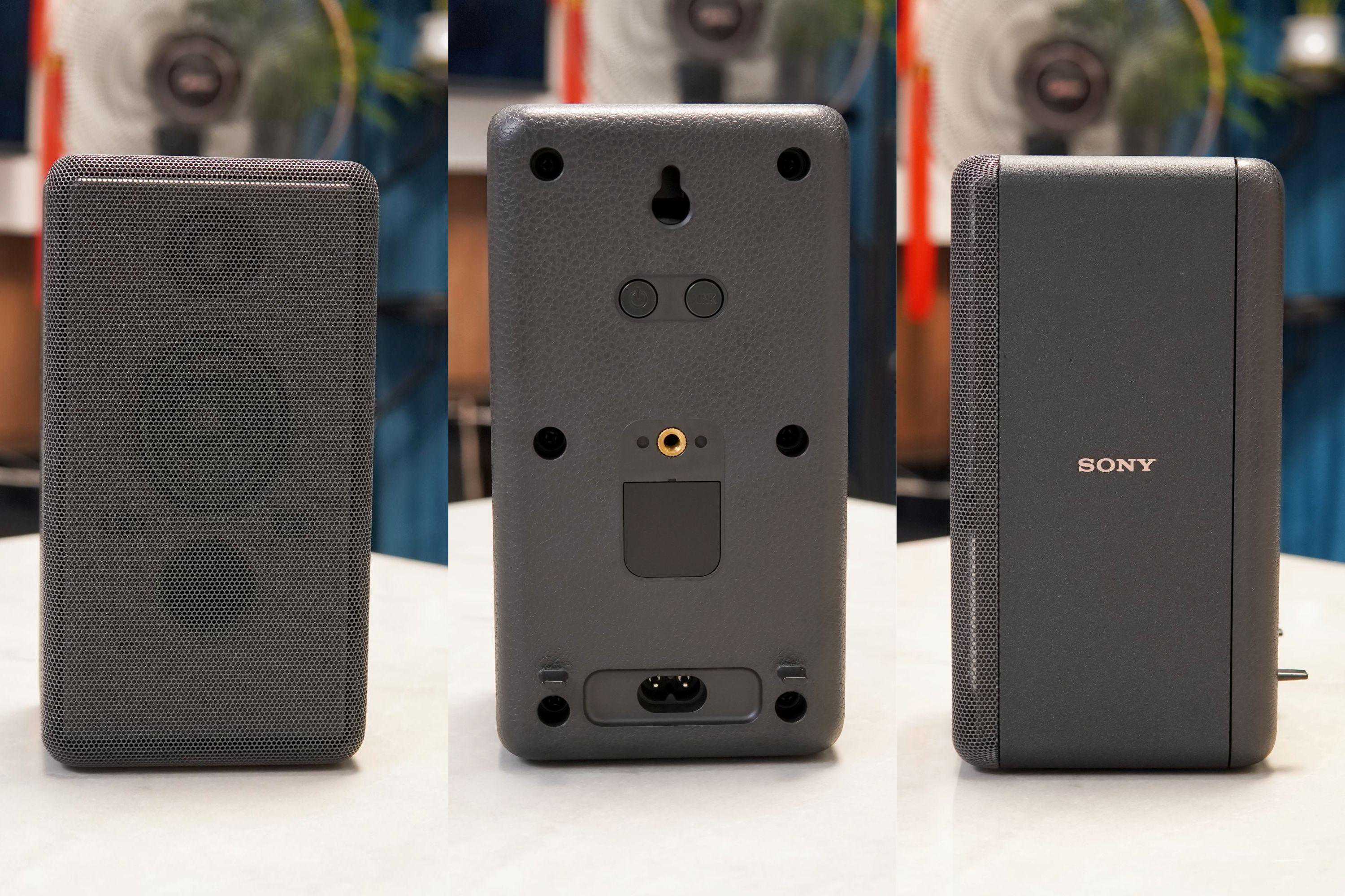 ▲索尼HT-A5000后置音箱正面为金属网结构,侧面为品质塑材,背面为皮质,四角都做了圆角,颜值不错。功能单元方面,索尼HT-A5000后置音箱搭载了全频扬声器和高频扬声器的双分频结构,来实现清晰、宽广的环绕声。如果必要的话,后置音箱背部也预置了螺丝孔,可以进行安装使用。索尼HT-A5000后置音箱通过线材接电使用。