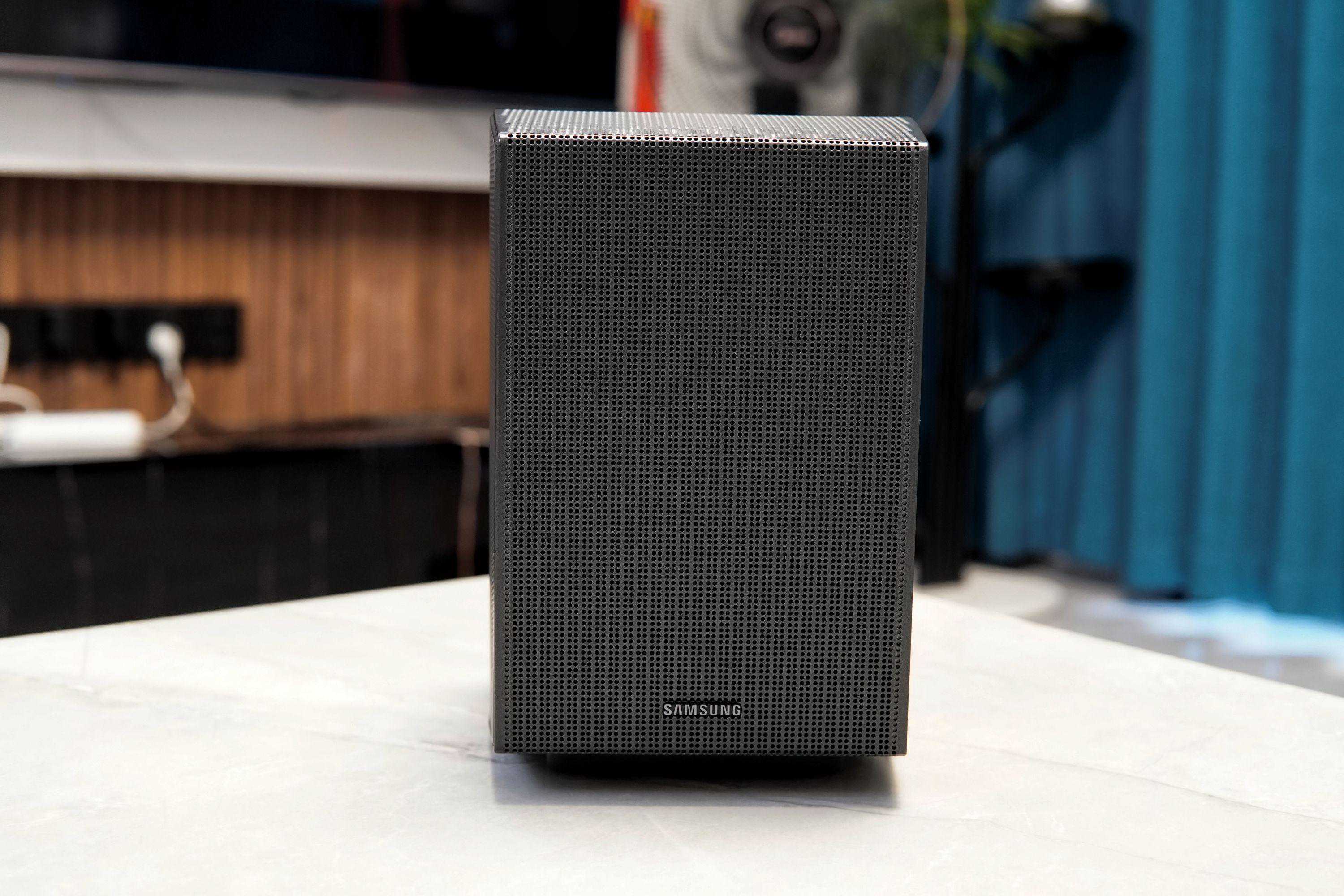▲三星HW-Q990C的重低音音箱音盆向侧,音盆出口有个顶盖,可以用于均化出音效果,机身重11.7kg,功耗为26W。