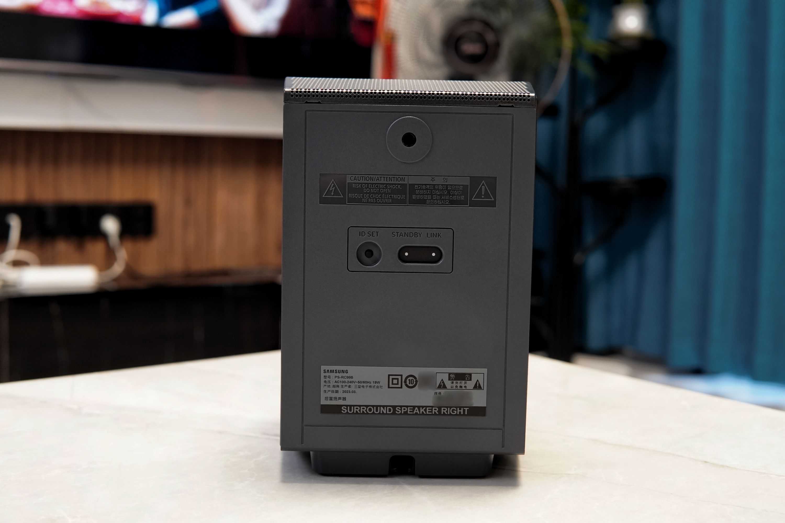 ▲三星HW-Q990C后置音箱外观偏向方正结构,自重较大(1.7kg/只),金属网结构质感很好,浮雕的“SAMSUNG”铭牌很有韵味。三星HW-Q990C后置音箱实现正射和环绕声效,通过线材接电使用。