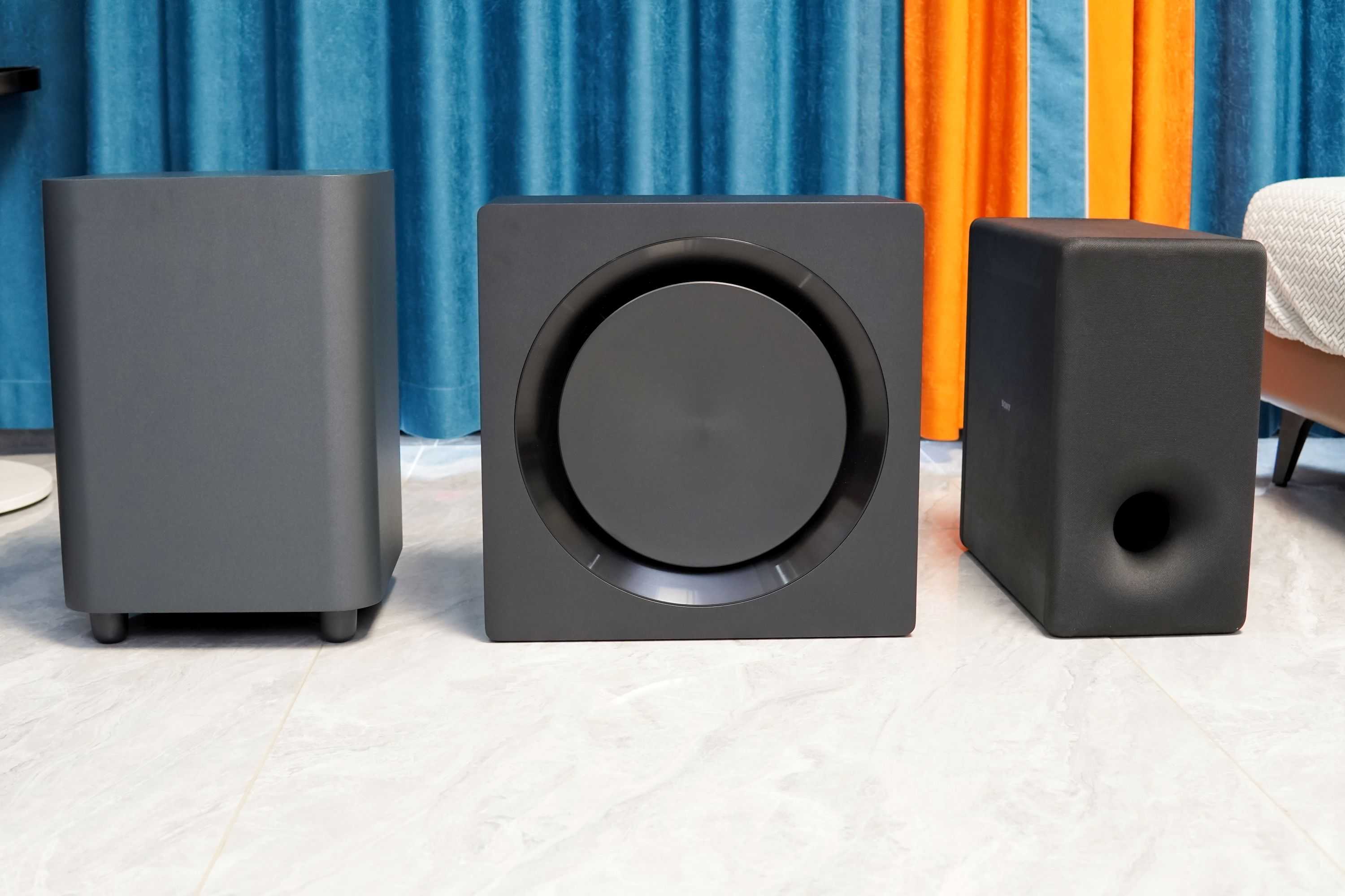 ▲3款重低音音箱中,索尼HT-A5000最为小巧轻便,JBLBAR1000最大最沉,三星HW-Q990C的结构则比较扁平。