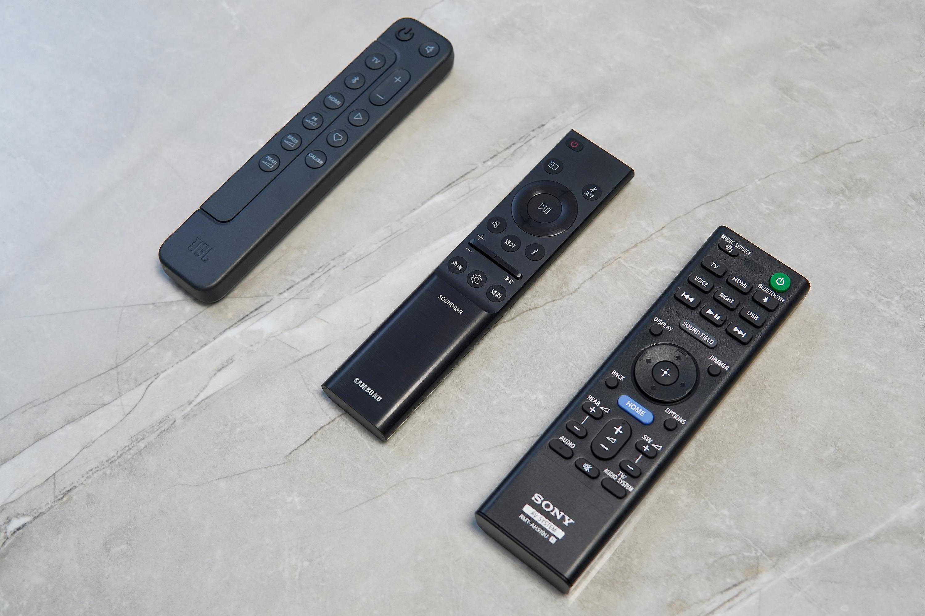 ▲就外观而言,我觉得JBLBAR1000方正、圆润、瘦长的造型最是不错;三星HW-Q990C的外观也跟当下的主流遥控器设计理念一致,质感上会逊色于JBL;索尼HT-A5000的遥控器更像是个上世纪的产物,相对比较土气。
