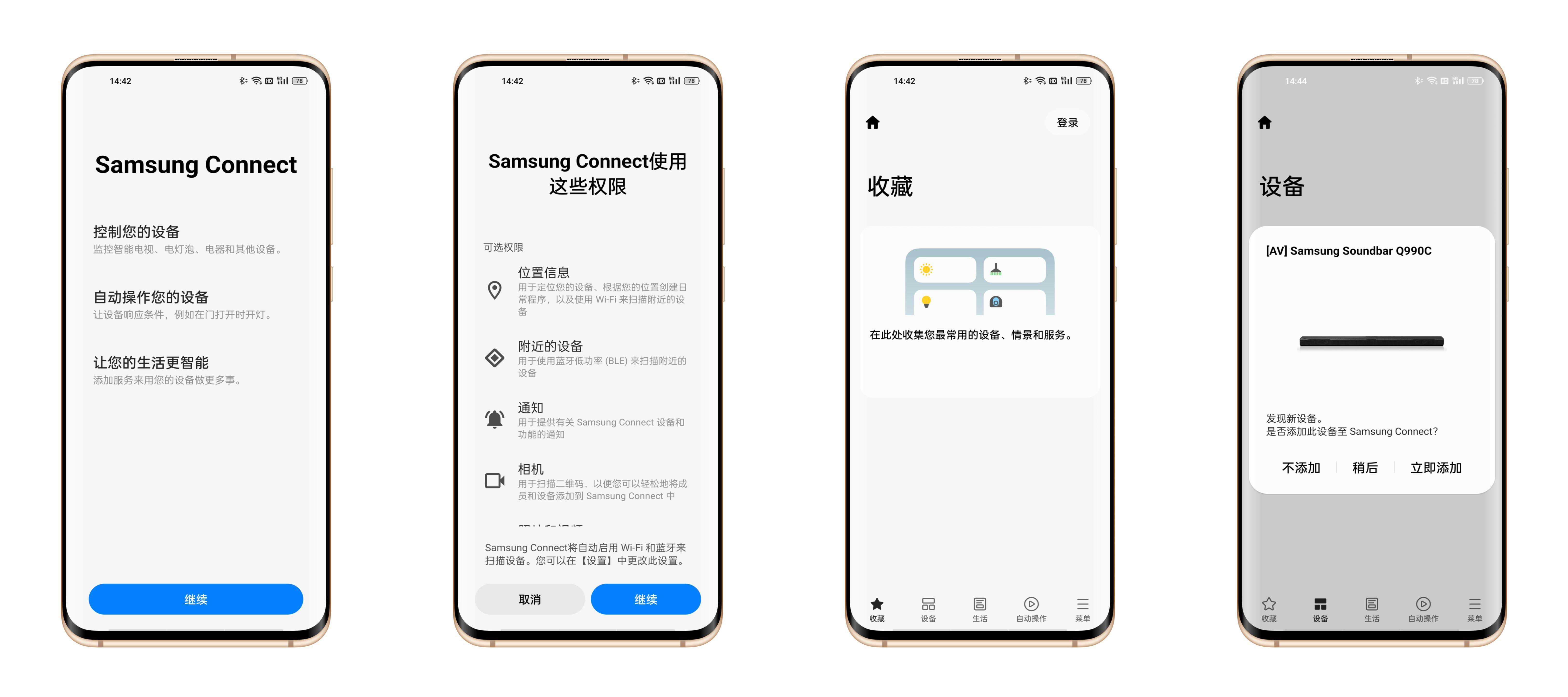 ▲三星HW-Q990C的App“SamsungConnect”可以比较快地识别出设备并进入连接步骤,功能方面比较完善,除了对设备本身的设置外,还有一些生活类功能。不过不足前文也提到了,需要注册Samsung账号,没一定技术水平可能注册不上。