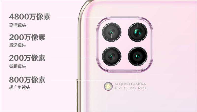 华为nova6SE后置四颗摄像头,采用了“高清+广角+微距+景深”的方案。具体来说,主摄像头采用1/2英寸的4800万像素传感器和F/1.8光圈的镜头,支持4合1光融合模式,可直出6000×8000像素高分辨率照片。
