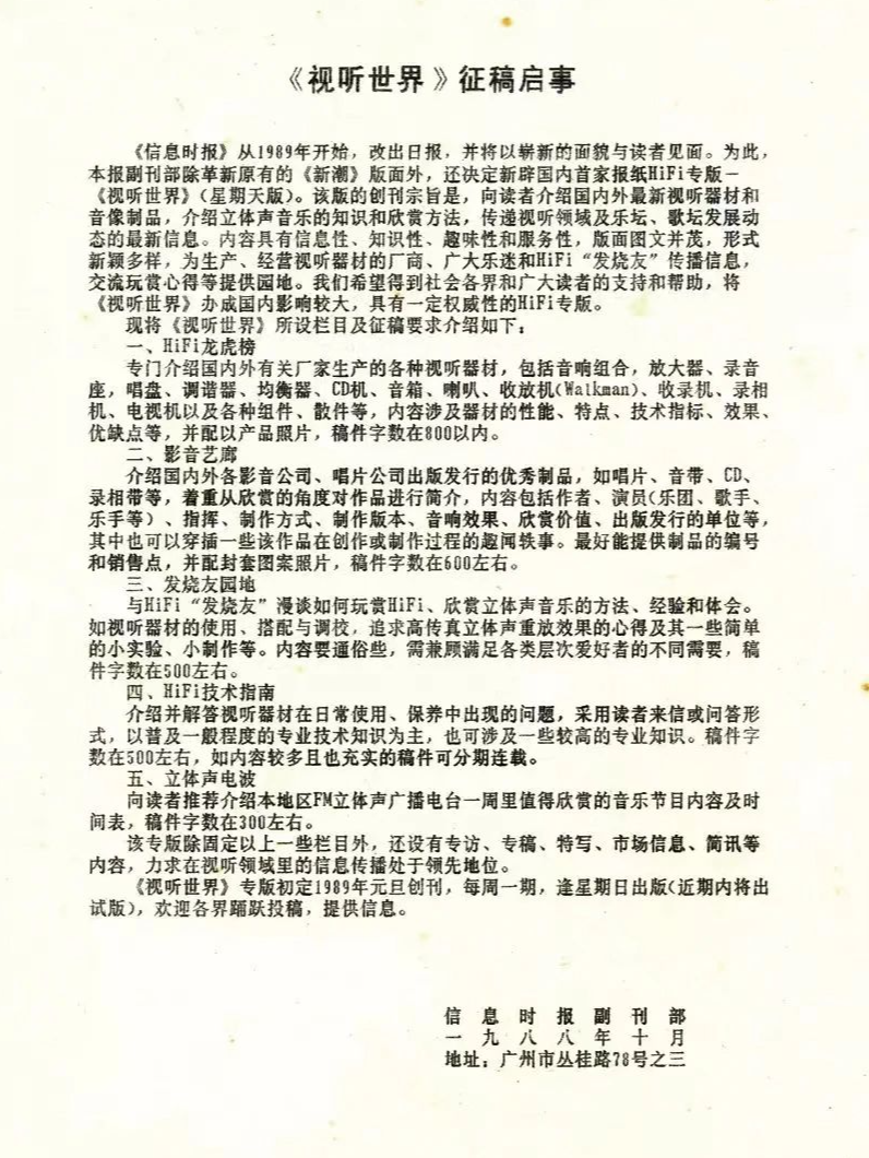 2023年国庆节闲暇无事,我便在家中收拾一下资料,不期然发现一份写于1993年的旧作,题目就叫《广州发烧友成长之路》,篇幅有8000多字。当时写作意图是想描述一下广州的发烧环境及渊源。写好后我把文章寄给当时刚创刊不久的《音响世界》杂志社,不久之后就收到主编的电话约我到杂志社谈谈。当我满心欢喜赶到杂志社后收到的却是退稿的消息,主编搓着手略有歉意地说:文章写得不错,但篇幅太长,不适宜在杂志发表,希望不要泄气,以后多给杂志社供稿云云……当时我年轻,也没多想什么,默默收起稿件就走了。