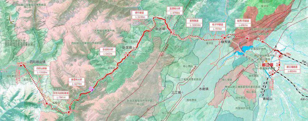都四山地轨道交通起于成灌高铁都江堰站,经虹口、龙池、映秀、耿达、卧龙、止于阿坝州小金县四姑娘山镇。线路正线长约为123.2km,新建桥梁25995.5米/25座,桥梁占正线线路长度的21.1%。新建隧道95074米/25座,占正线线路长度的77.2%。全线新建车站12座(都江堰、永丰、乐园、虹口、龙池、映秀、耿达、卧龙、映雪、邓生沟、巴朗山、四姑娘山站),车辆基地1座。拟采取最高设计行车速度120km/h、轨距为1000mm的双线米轨方案。