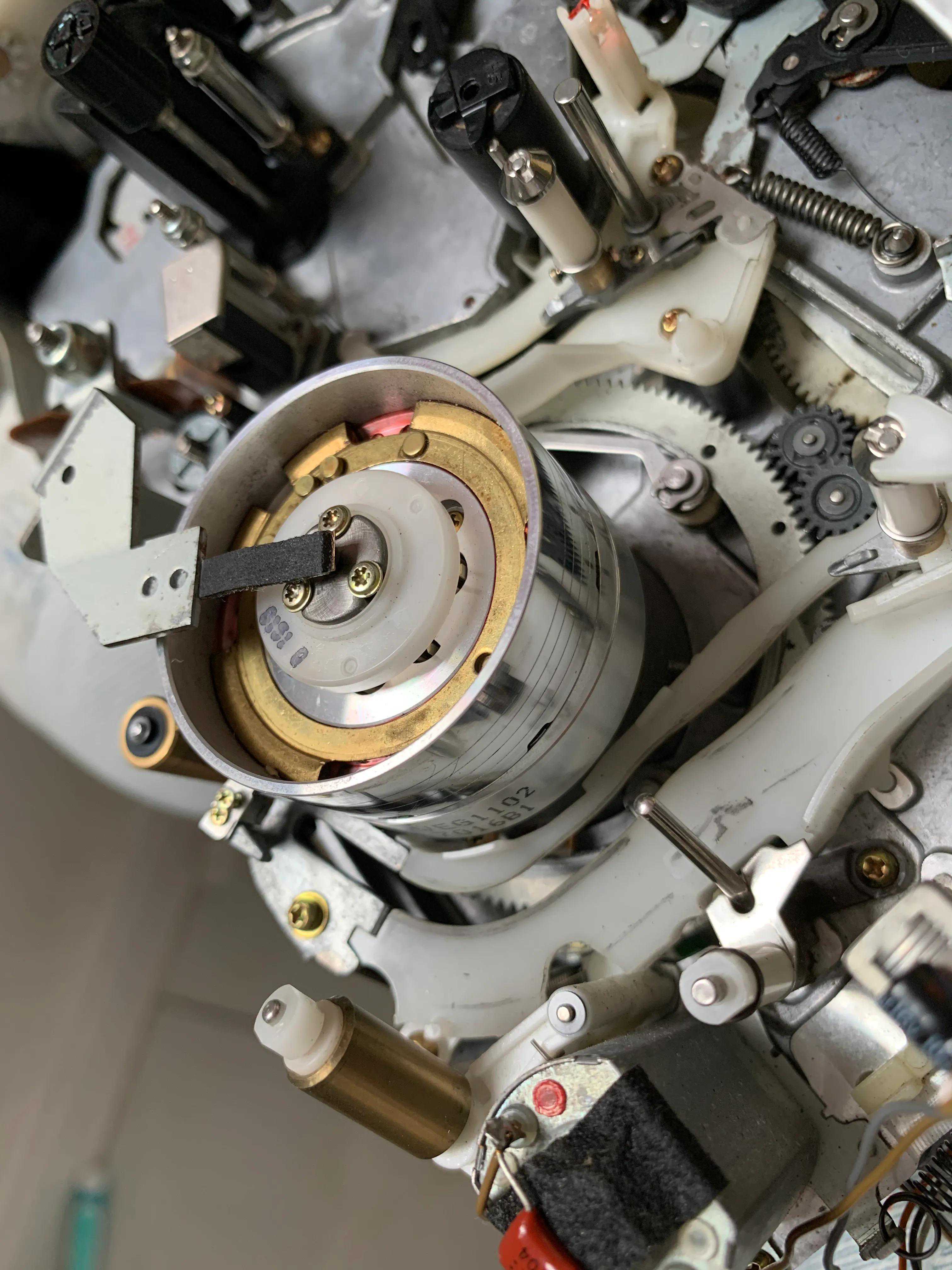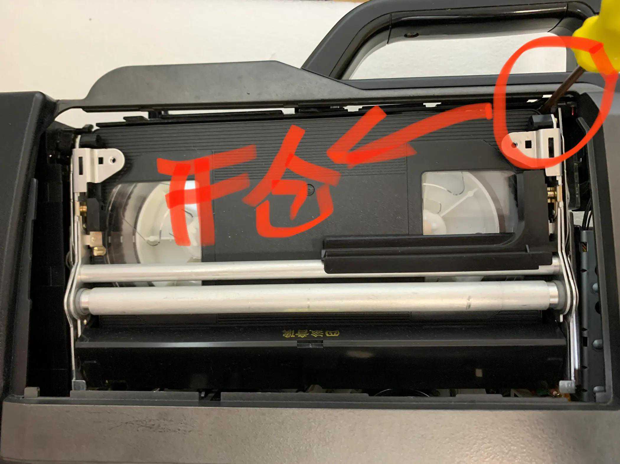 因突然断电或绞带等原因带仓无法弹开,卸下带仓盖,紧贴录像带外壳右上角,用尖细工具插入,探到动件轻轻下压,带仓便会脱钩弹出。注意此操作在录像带未正确回卷入内时会有一些撕扯误伤。反之仓门无法关闭的时候,先排查挂钩是否变形,用尖嘴钳子扶正,或需要手工复位齿轮或先等待摄像机自身通电自检复位。