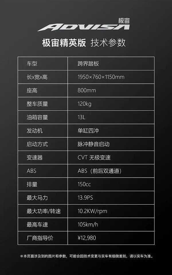 极宙在配置上也是相当给力,配有ACG脉冲启动、双通道ABS、德尔福电喷、液晶仪表、自动启停、无钥匙启动、渝安减震、边撑熄火、双线油门等,配置上个人觉得厂家还是非常有诚意的,也看得出想把这台车做好。