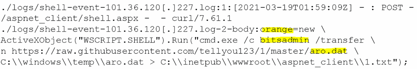 传播过程2021年3月19日,Unit42观察到攻击者通过一系列零日漏洞(CVE-2021-26855和CVE-2021-27065)(称为ProxyLogon)利用源自[.]227的Exchange服务器。成功利用后,一个webshell被上传到一个可公开访问的web目录,允许以最高权限级别执行代码。