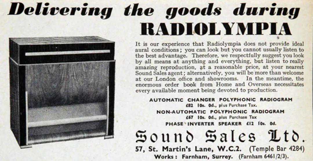 SoundSales在1947年推出的SoundSalesPolyphonicRadiogram,内置了收音机r、自动换片唱盘和Auditorium喇叭单元,以PX4输出的胆机推动。