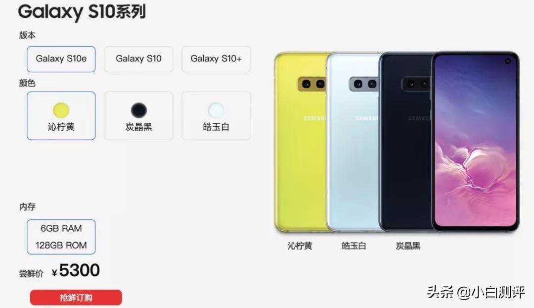 三星S10e采用5.8英寸19:91080P分辨率的直屏,机身三围142.2*69.9*7.9mm,重150g,前置单摄1000万像素,后置双摄1200万像素(/可变光圈)+1600万像素超广角镜头,3100mAh电池,侧面指纹识别。国行仅有6+128GB一个版本,碳晶黑、皓玉白、沁柠黄3种配色,尝鲜价5300元,预计正式售价会低于5000元,4999元?