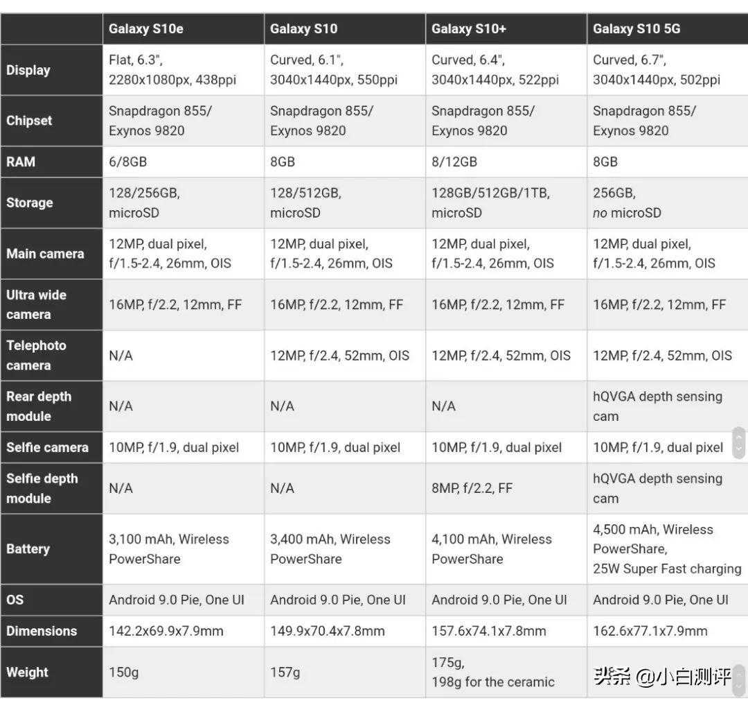 三星S10采用6.1寸19:92K曲面屏,机身三围149.9*70.4*7.8mm,重157g,8GLPDDR4x,前置1000万像素,后置三摄:1200万像素可变光圈/+1200万像素长焦(F/2.4带OIS)+1600像素超广角镜头(F/2.2),超声波屏幕指纹,3400mAh电池。