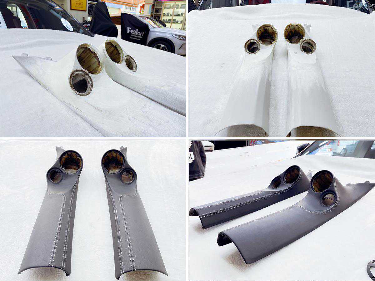 前声场的三分频套装高音和中音采用A柱倒模的方式进行安装,而倒模涉及到精准定位,打磨成型,安装复原,最后才呈现出完整效果,非常考验师傅的工艺水平。我们来看一下A柱的施工过程: