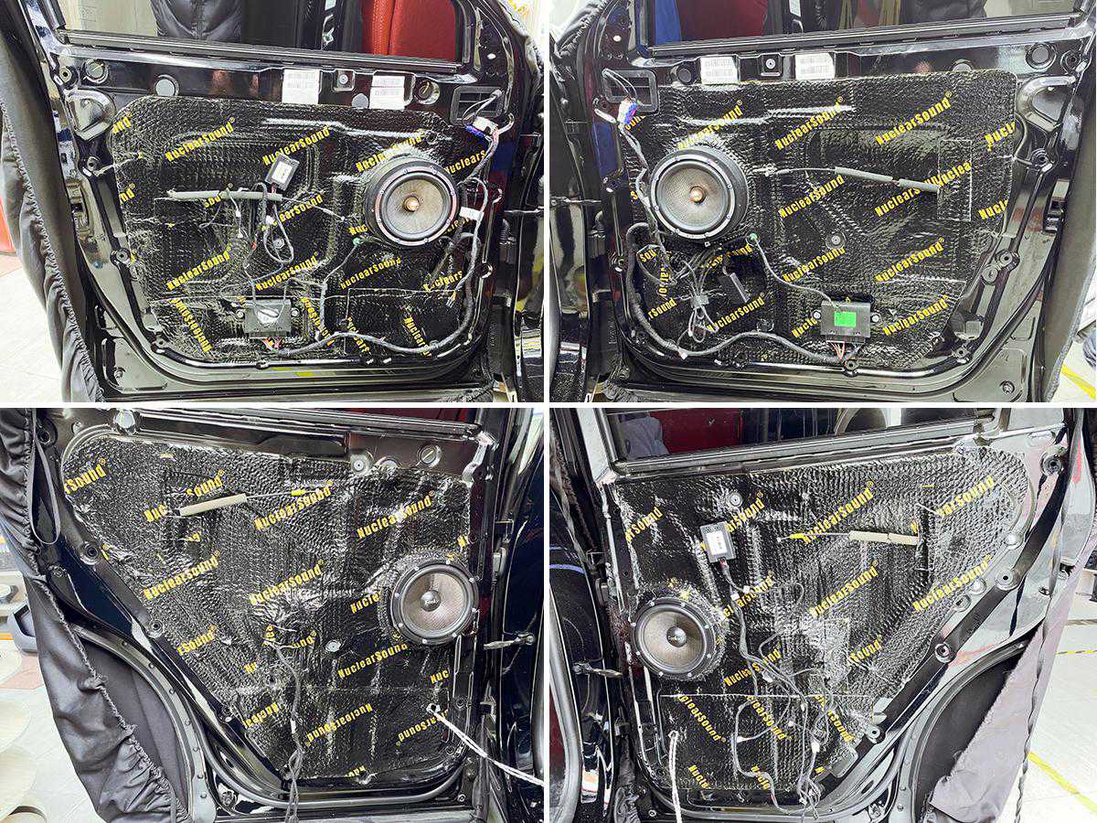 然后就是门板中低音喇叭的安装,喇叭安装之前我们还需要对门板进行隔音降噪处理,使用门店的环保止震材料,对门板的内外双层进行粘贴施工,降噪的同时还能提升音响音质。而喇叭在隔音完成后就安装在原喇叭位置。
