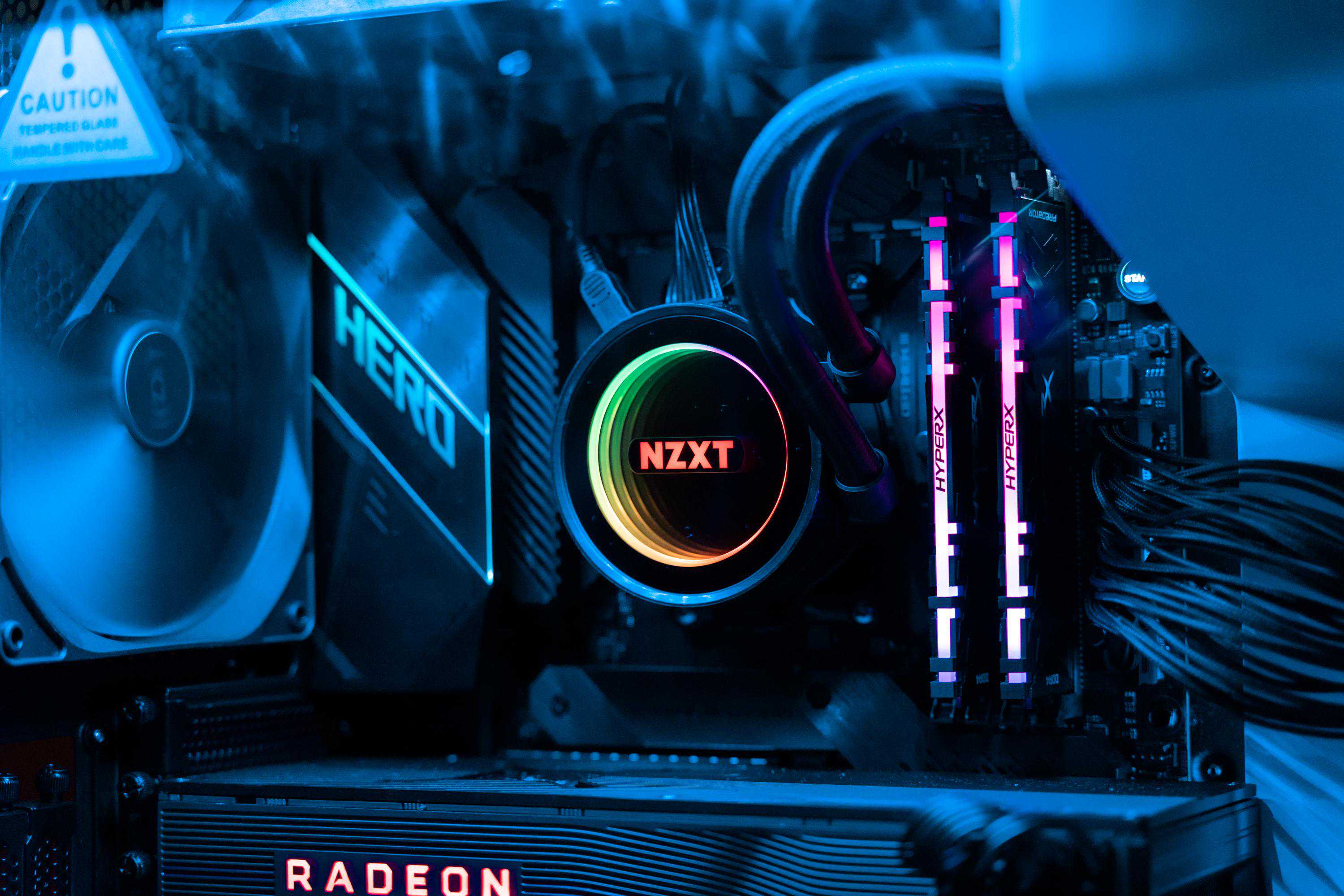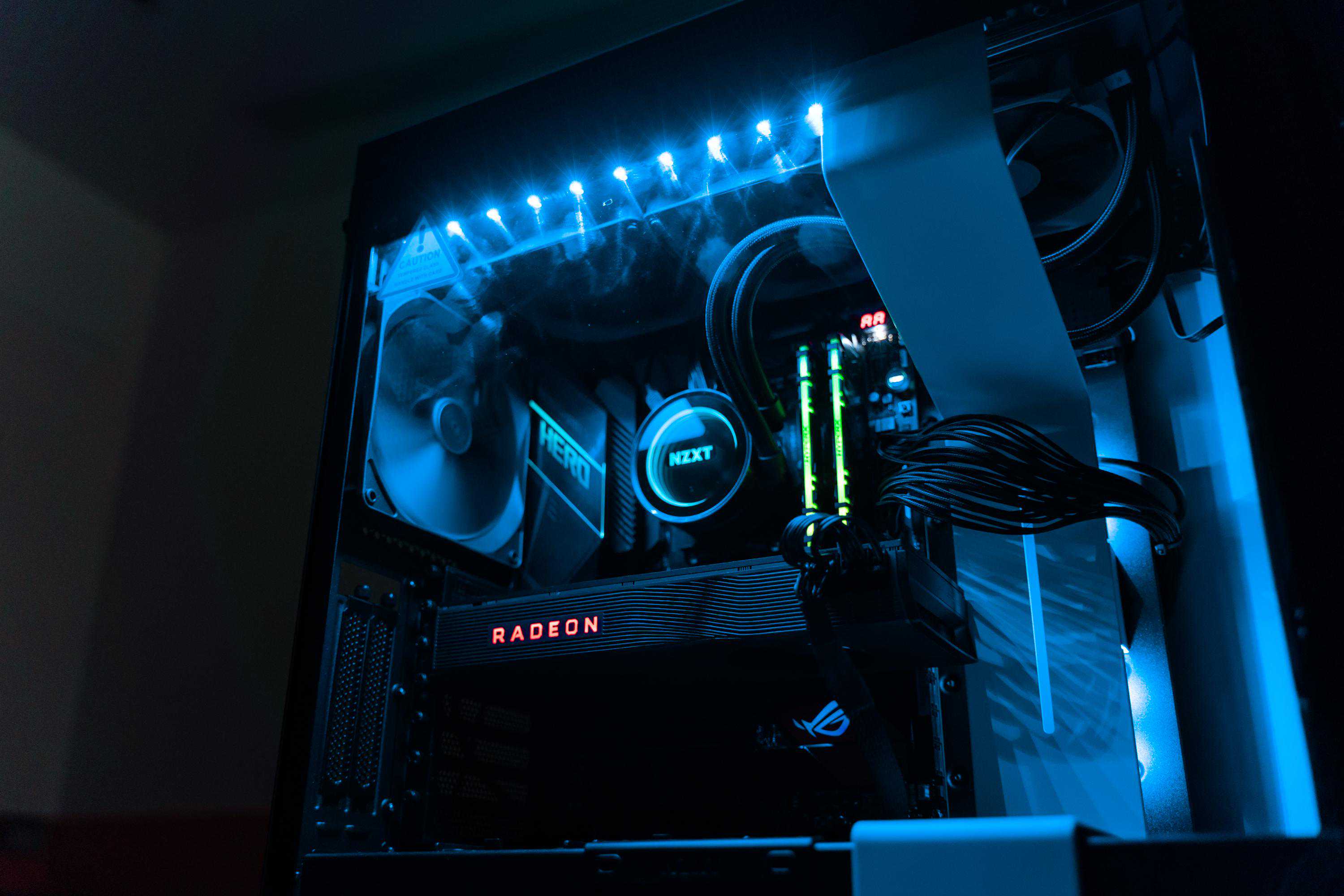 通过这个角度基本可以看到本次攒机的所有发光部位(除了电源):H710i机箱自带的LED灯条、x72冷头、HyperXpredator内存、C8H的I/O散热装甲及南桥散热,还有Radeon红色信仰灯,其实除了显卡信仰灯都是RGB的,不过我是不喜欢跑马灯光污染的,就全部调成了青色,在黑暗中显得深邃幽静——只有那一抹醒目的红色信仰。