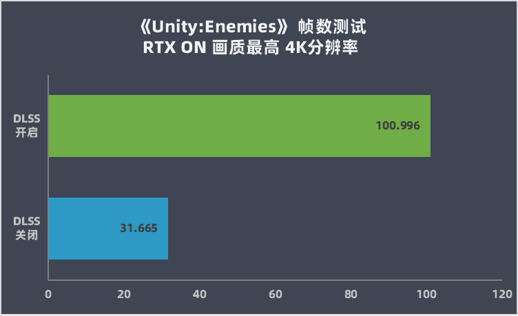 除了虚幻引擎外,Unity引擎也提供了对RTX光线追踪、DLSS3和NVIDIAReflex的完整支持。最后我们测试一款画质爆炸的Demo《Unity:Enemies》。这款Demo就没有那么多档位可以选了,只能调整开关。在开启DLSS3后,帧数暴涨了近3倍,4K渲染丝般顺滑。