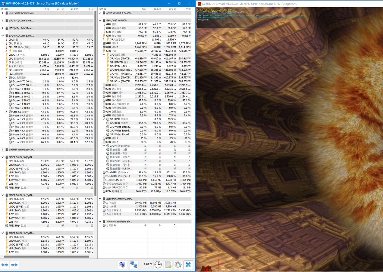 这样一款非公旗舰,会在公版显卡的基础上有多大的进步呢?接下来我们进行理论测试,首先是单烤甜甜圈,烤机10分钟后,核心温度稳定在63.9℃左右,功耗稳定在446W左右,与公版的表现基本一致。如果配i7/i9这样等级的处理器的话,还是老老实实上1000W以上的电源吧,最少也要850W不虚标的电源。