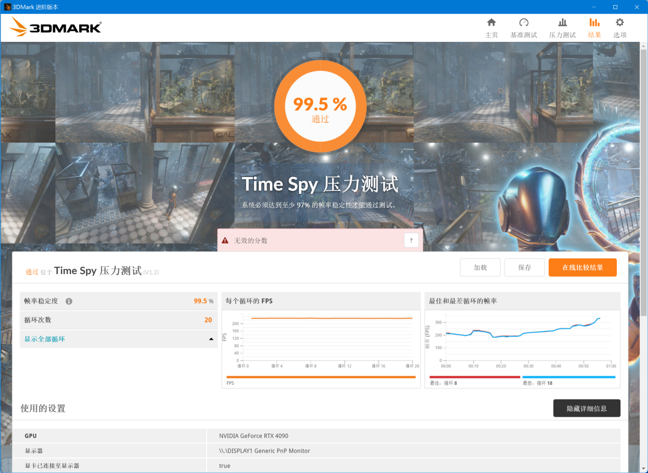 接下来进行3DMark压力测试,这个测试可以检测连续跑分下显卡性能有没有发生下降,一般97%以上才算合格的显卡。实测技嘉RTX4090GAMINGOC魔鹰24G的得分为99.5%,几乎没有降频,完美通过测试。