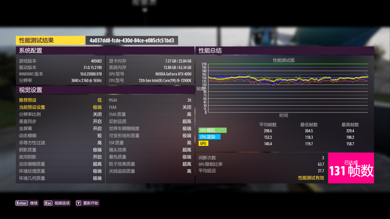 而在优化出色的《极限竞速:地平线5》中,我们开启4K极端画质,依旧能达到平均131帧。看来在RTX4090的狂暴性能下,这款赛车游戏即便是8K60帧也能搞定了。
