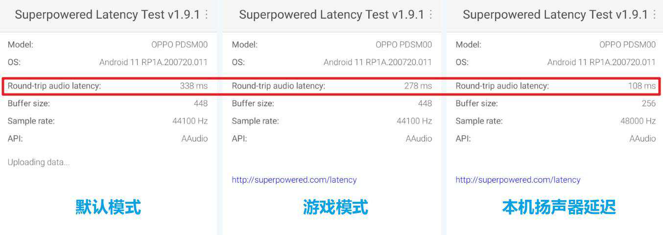 连接OPPOReno5Pro的效果(本机音频延迟高达108ms,游戏模式延迟278ms)