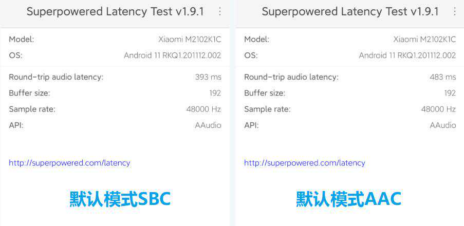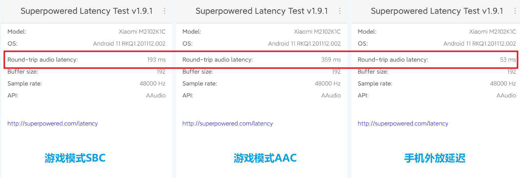 小米11Ultra连接OPPOEncoAir,默认模式下的延迟控制一般,都是400ms级别。