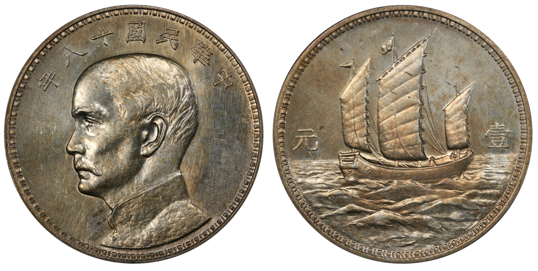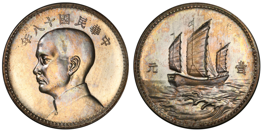 Lot34152RepublicSunYat-sensilverSpecimenAmericanPattern"Junk"DollarYear18(1929)Hangchowmint,KM-Pn100,LM-95,Kann-616,Shih-D3-13,Chang-CH197(Rare),WS-0139,Wenchao-910(rarity2stars),民国十八年孙中山像美国版三帆壹元样币PCGSSP58这枚样币以美国费城造币厂所制模具铸造,故名。出自:TaHanMCC集藏
