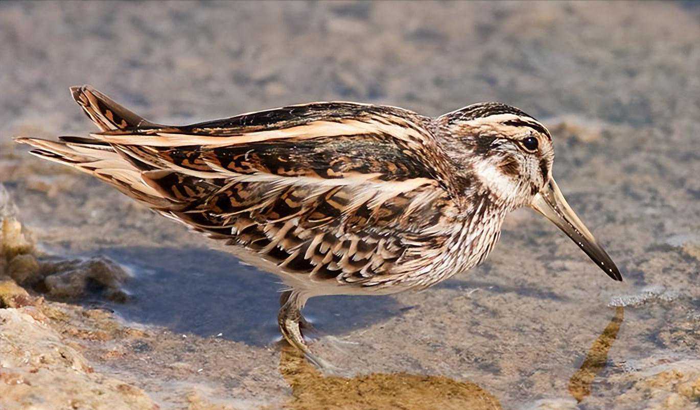 彩鹬是一种小型涉禽,体长25厘米左右。嘴细长,尖端向下弯曲,雄鸟头具淡黄色中央纹。眼周黄色,并向后延伸成一柄状带。背具白色横斑,两侧具黄色纵带。