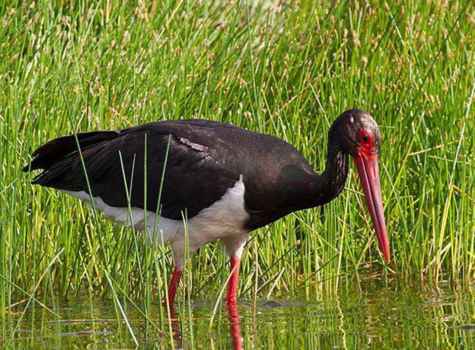 黑鹳是白俄罗斯的国鸟,嘴和脚红色。身上的羽毛除胸腹部为纯白色外,其余都是黑色,在不同角度的光线下,可以映出变幻多种颜色。