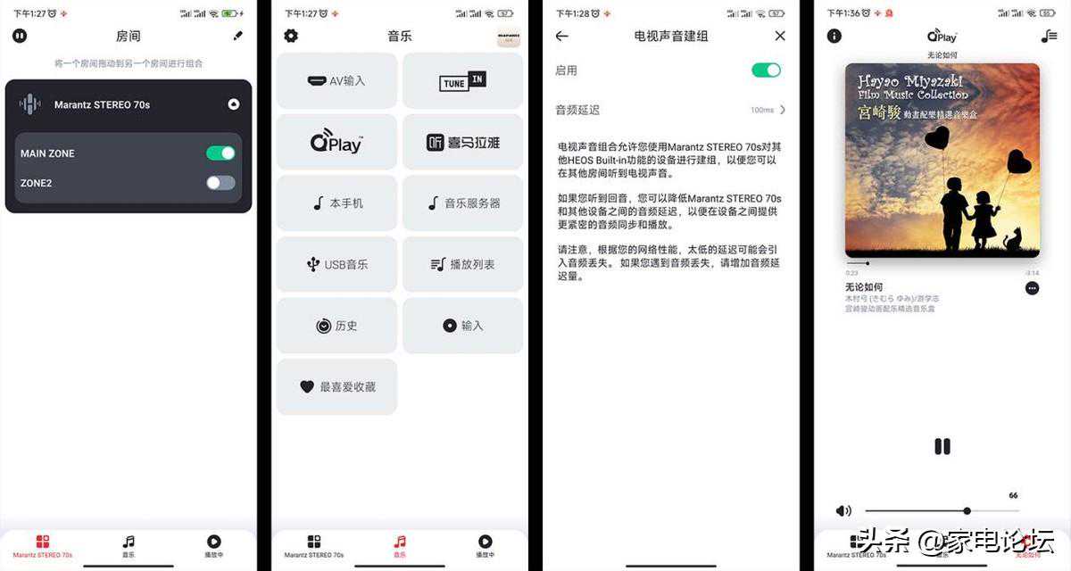 丰富的菜单设置和HEOS流媒体应用将马兰士Stereo70s连接显示设备后,可以通过遥控器进入该机的设置菜单界面,UI设计与目录框架与马兰士的AV机型大同小异,只不过相对精简一些。建议首次使用时在扬声器一栏中,根据实际环境设置相应的扬声器布局、距离、电平等参数。