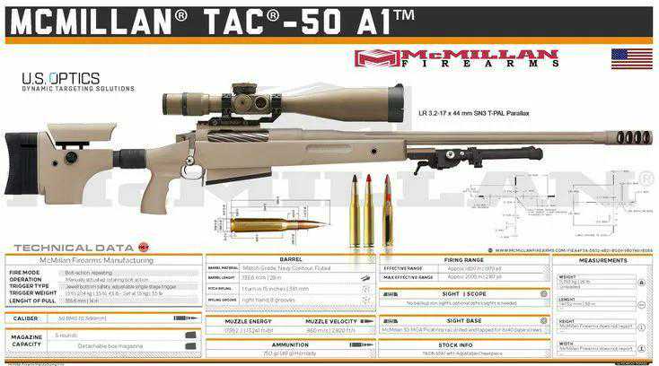 TAC-50狙击步枪全名麦克米兰TAC-50狙击步枪,这是一把由美国麦克米兰兄弟步枪公司在1980年推出的12.7×99NATO(.50BMG)狙击步枪/反器材步枪。作为军队及执法部门专用的狙击武器。作为加拿大的制式狙击步枪该枪精度颇高,当装上发射比赛级弹药的精度高达0.5角分(MOA)。
